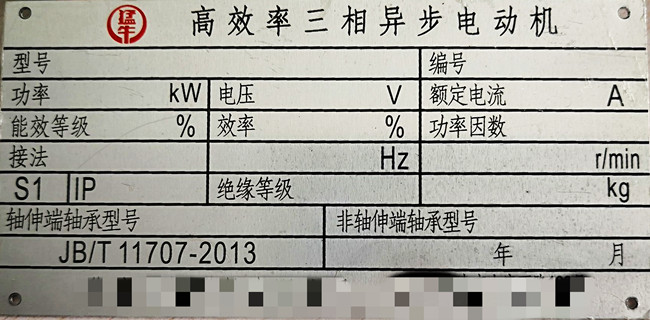 參照上圖中的電動機銘牌,在上面會詳細標準電動機的型號規(guī)格、生產(chǎn)編號、功率、電壓、額定電流、能效等級、效率值、絕緣等級、額定轉速、重量、出廠編號、生產(chǎn)日期等。