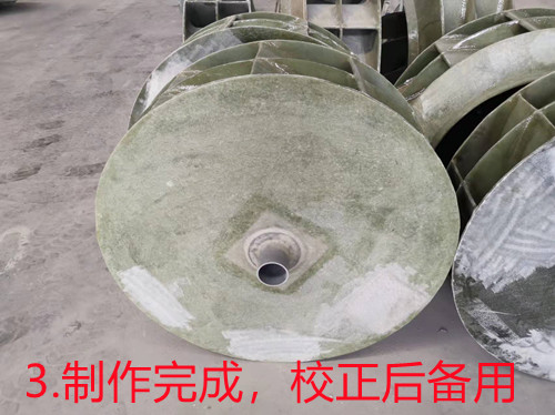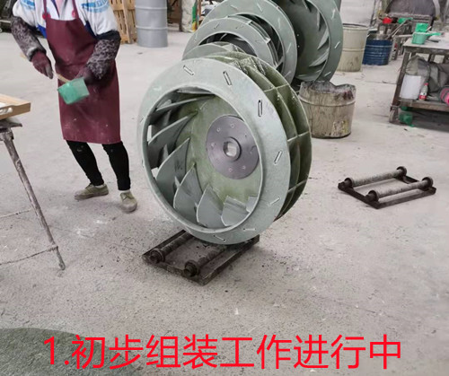 a、首先是將玻璃鋼風機葉輪需要的配件單獨制作出來,如葉片、底座、頂蓋、等。然后人工進行組裝,組裝工作完成之后再使用樹脂混合材料進行加固。